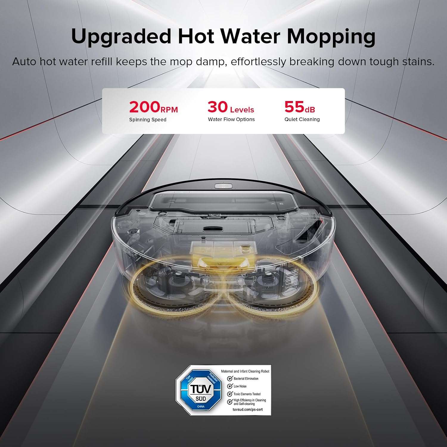 • 22,000Pa* Suction & Hot Water Mopping – Powerful & Deep Cleaning: With 22,000Pa* suction power, the Saros Z70 effectively lifts dirt, dust, and debris from various floor surfaces. The FreeFlow Main Brush minimizes tangling with long hair, while the 0% Hair Tangling Side Brush* prevents wraparound for uninterrupted cleaning. Built for efficiency, it delivers strong suction while keeping maintenance simple and easy. Upgraded Hot Water Mopping accelerates the breakdown of tough stains, while the integrated water tank ensures the mop stays damp. With a 200RPM spinning speed and 30 adjustable water flow levels, it's fearless of even the most stubborn stains