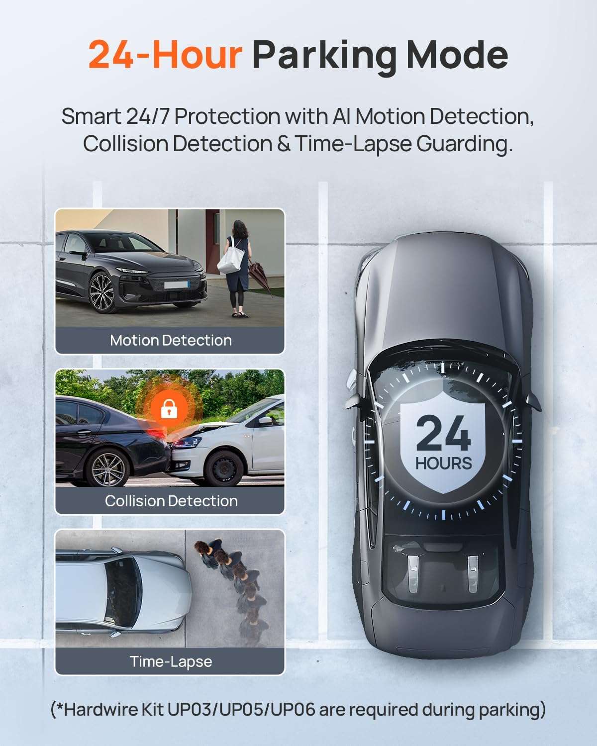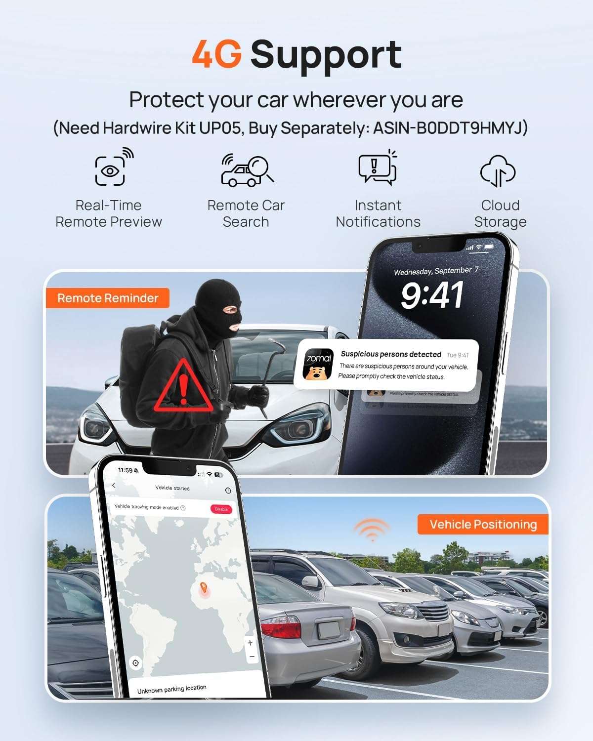 Ayrıca satılan 4G Hardwire Kit UP05 (ASIN: B0DDT9HMYJ) dash cam-ə qoşularaq avtomobilə uzaqdan baxış, giriş, bildirişlər və bulud yaddaşı imkanları yaradır. Avtomobilinizlə bağlı hər hansı qeyri-adi fəaliyyət baş verdikdə dərhal xəbərdar olun. Bu funksiya avtomobilinizin təhlükəsizliyini əhəmiyyətli dərəcədə artırır və evdə və ya yolda olmağınızdan asılı olmayaraq sizə rahatlıq verir.