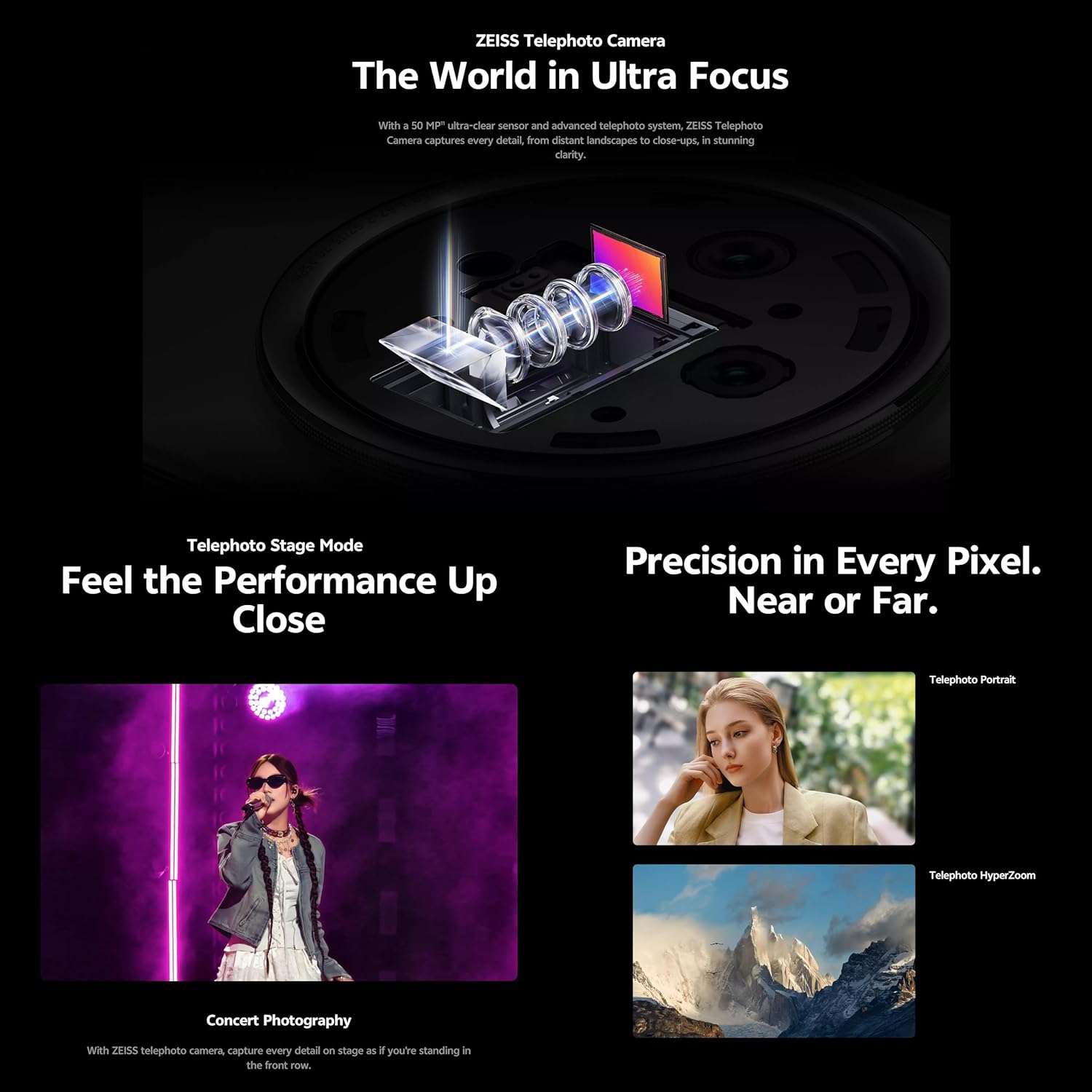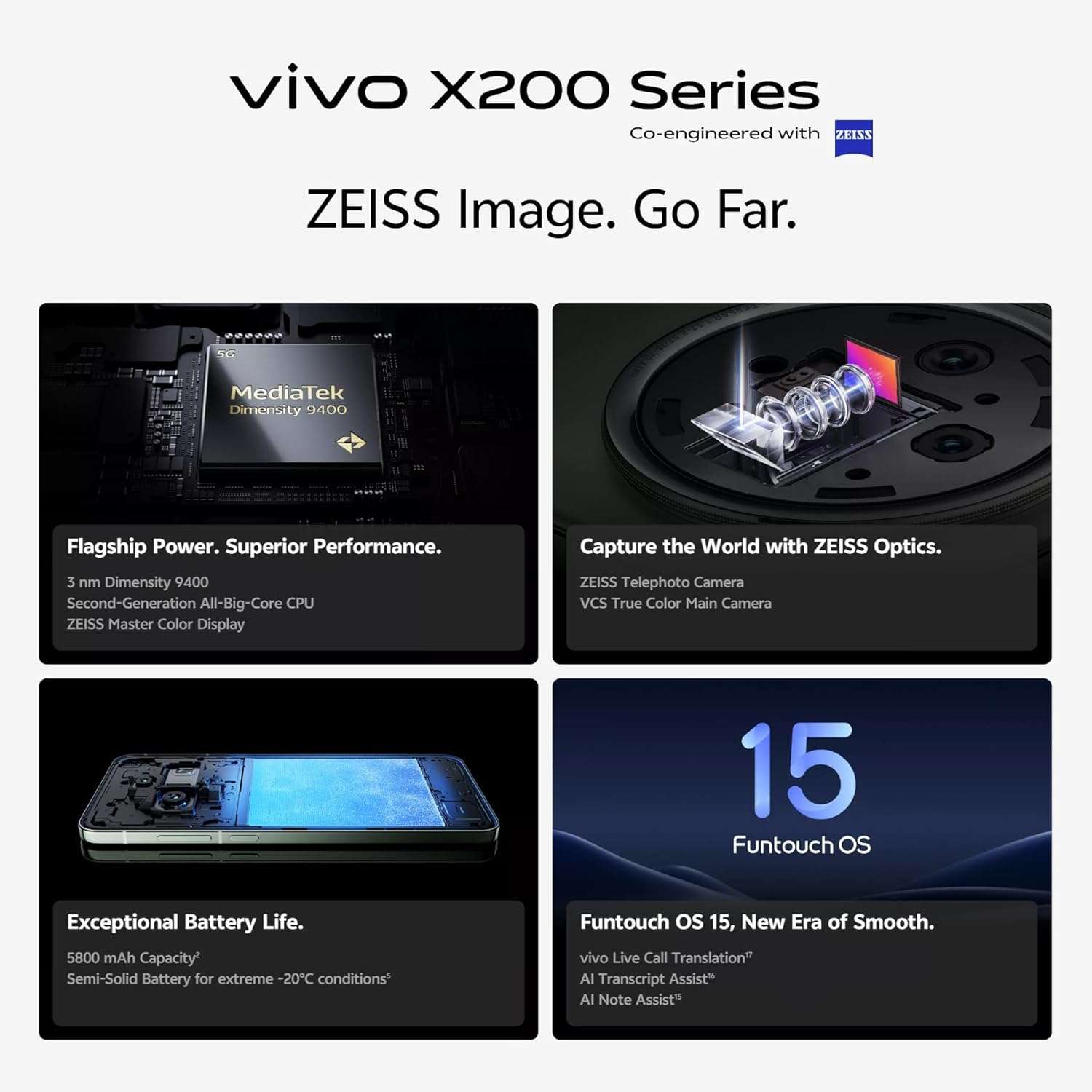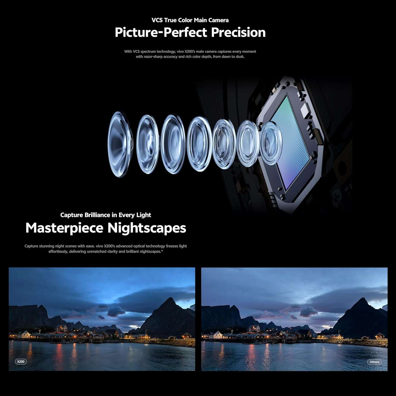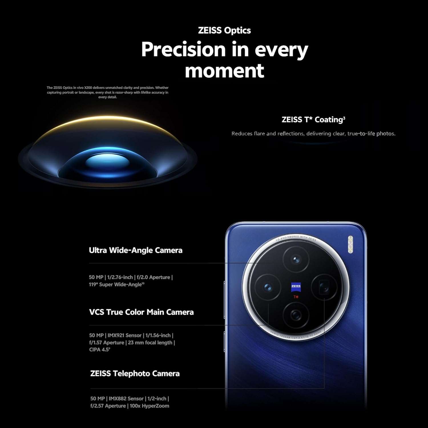 vivo X200 50 MP VC True Color əsas kamera, 50 MP telefoto kamera və 50 MP ultra geniş bucaqlı kamera ilə təchiz olunub. VCS spektr texnologiyası sayəsində əsas kamera hər anı dəqiq və zəngin rəng dərinliyi ilə, sübhdən axşama qədər dəqiq şəkildə çəkir. Telefoto kamera isə uzaq mənzərələrdən yaxın planlara qədər bütün detalları əhatə edir. Müxtəlif portret rejimləri ilə X200 sizə istənilən məsafədən mükəmməl portretləri çəkmək imkanı verir.