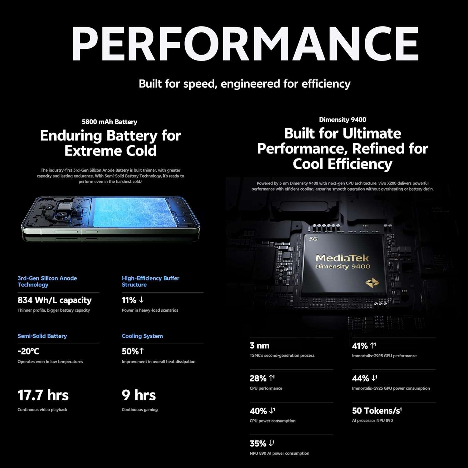 vivo X200 5800 mAh batareya ilə təchiz olunub. Sənayedə bir ilk olan 3-cü nəsil silikon anod batareya daha incə quruluşda, lakin daha böyük tutum və uzunömürlü istifadə ilə fərqlənir. Yarı-bərk batareya texnologiyası ilə ən sərt soyuqlarda belə yüksək performans göstərir. Davamlı video izləmə müddəti təxminən 17.7 saat, davamlı oyun müddəti isə təxminən 9 saatdır.