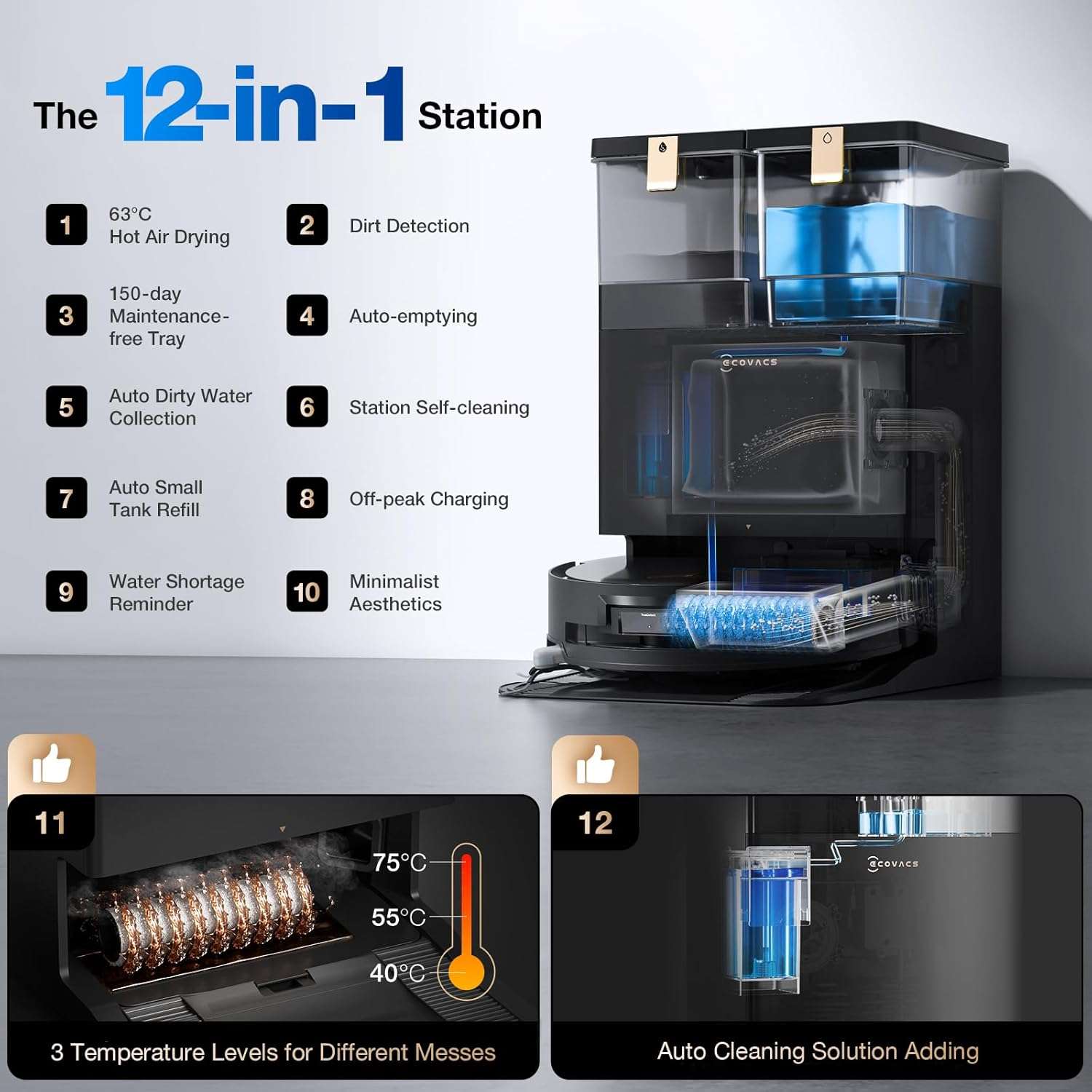 Model: ECOVACS DEEBOT X8 PRO Omni Robot Vacuum and Mop, OZMO Roller Instant Self-Washing Mopping,18000Pa Suction Hot Water Mop Washing, Auto Cleaning Solution Adding, Hot Air-Drying, Self-Emptying Black
