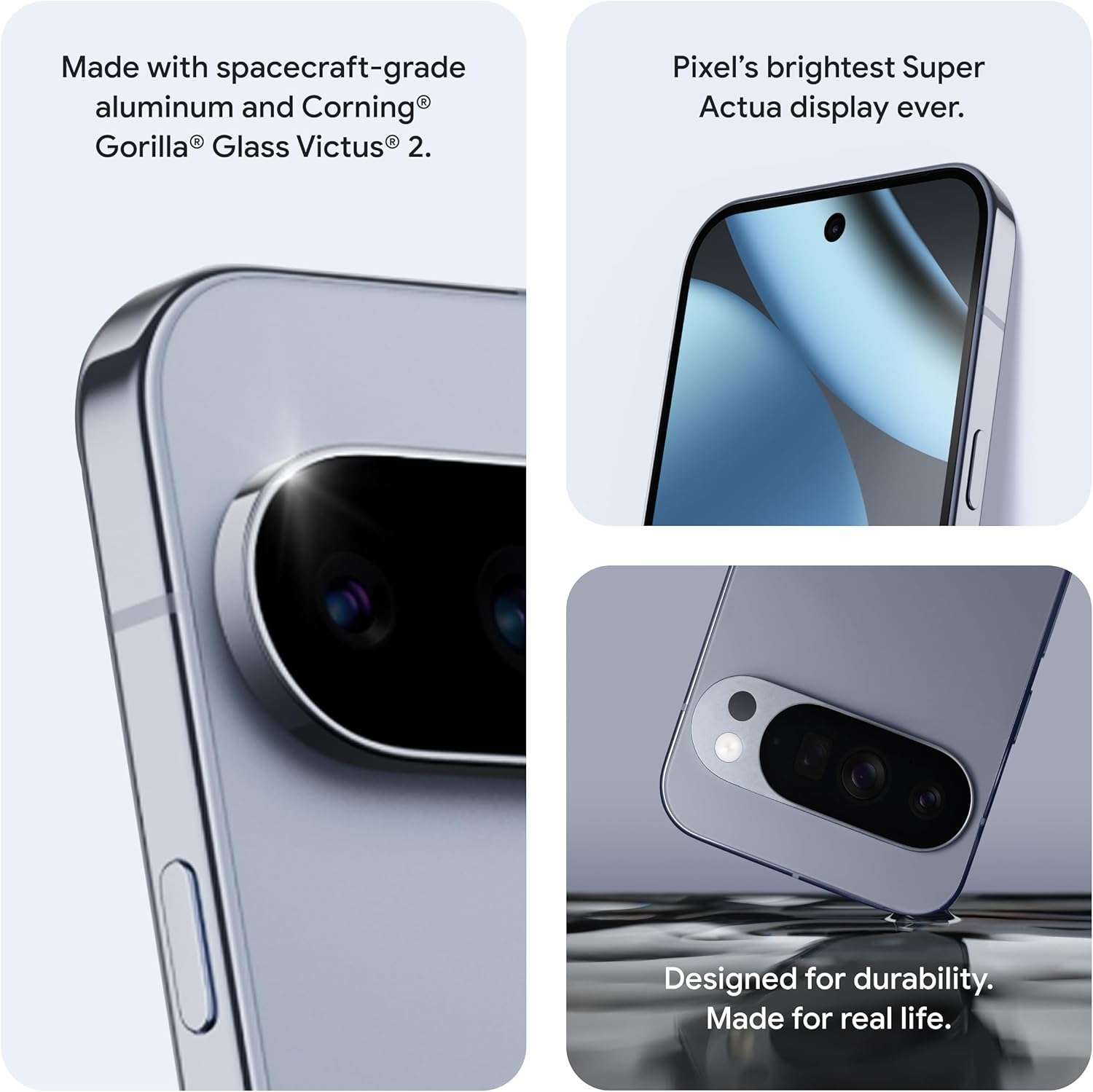 • Pixel 10 Pro is built - durable aluminum and Corning Gorilla Glass Victus 2 for scratch and drop resistance; the 6.3-inch Super Actua display - 3,300-nit peak brightness is easy on the eyes, even in direct sunlight[3,13,18]