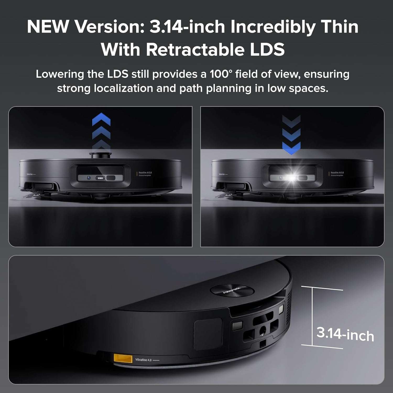 Reach the Unreachable: Featuring a sleek 3.14-inch ultra-thin design, the retractable LDS and RGB camera collaborate for optimal Dirt Detection. The top-mounted ToF sensor smartly adjusts the LDS height, maintaining a 100° viewing angle even in low-light and tight spaces for comprehensive cleaning coverage.