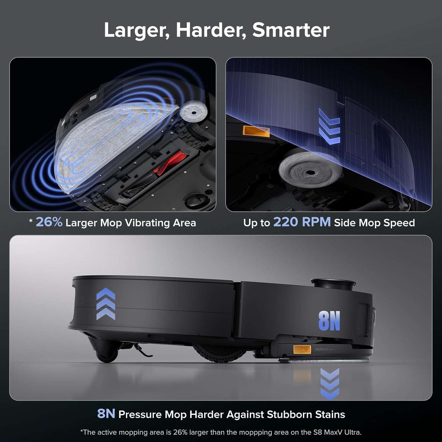 VibraRise 4.0 Self-Detaching Mopping System: Effortlessly switch between vacuuming and mopping with automatic mop disassembly and assembly. Clean carpets without moisture while the 18mm Auto-Lifting Brush and Mop adapts to various surfaces for a thorough, ultimate clean.