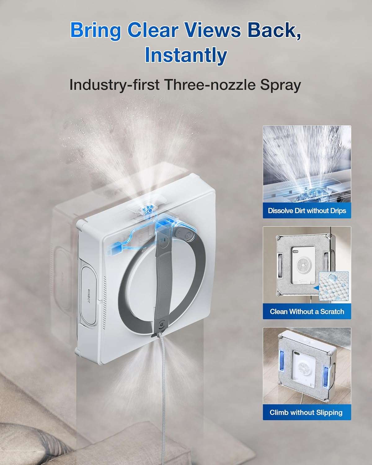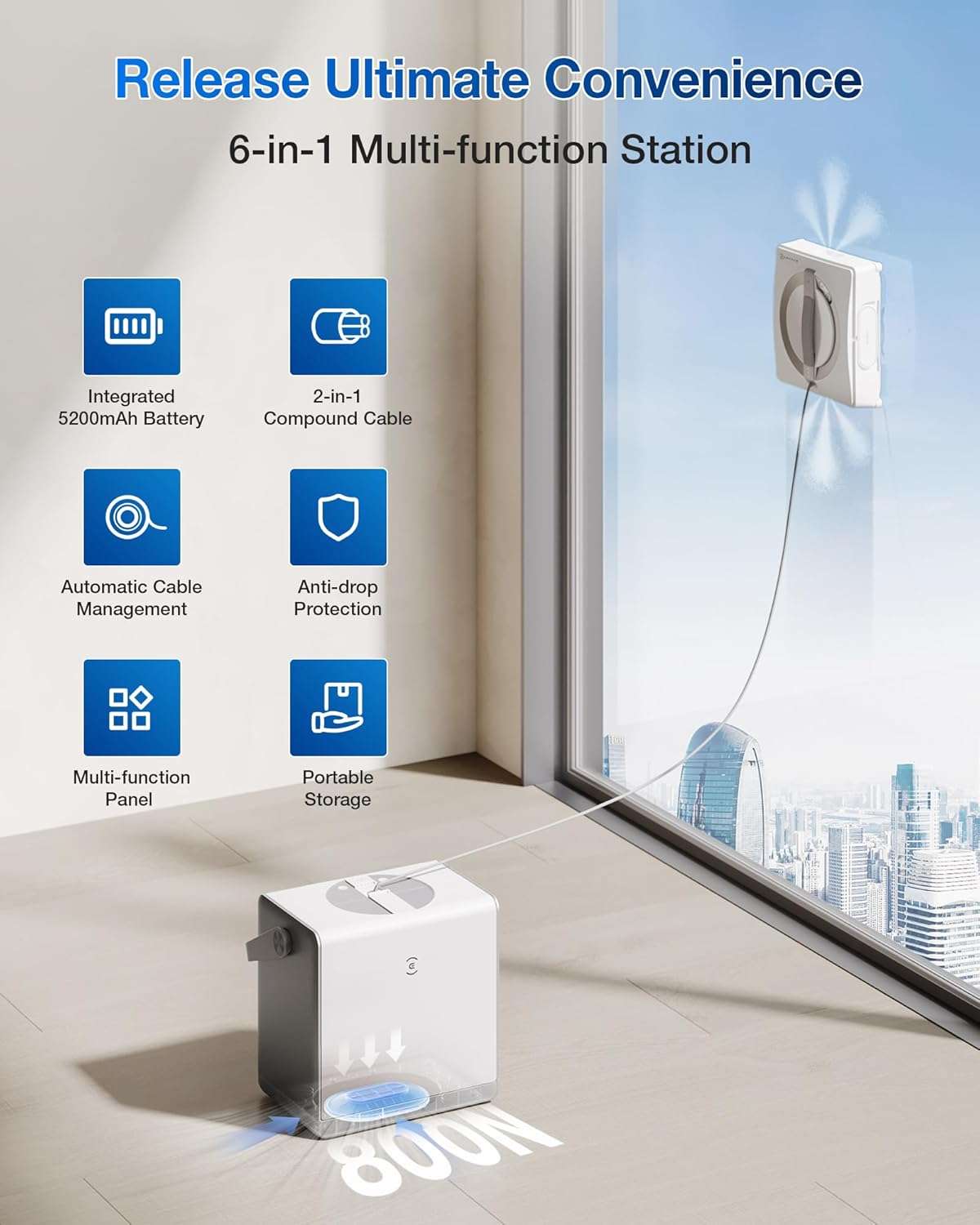 WINBOT W2 PRO OMNI оснащен многофункциональной станцией 6-в-1, которая выполняет функции панели управления, зарядного устройства, стабилизатора и портативного хранилища, делая процесс очистки окон более удобным и безопасным.